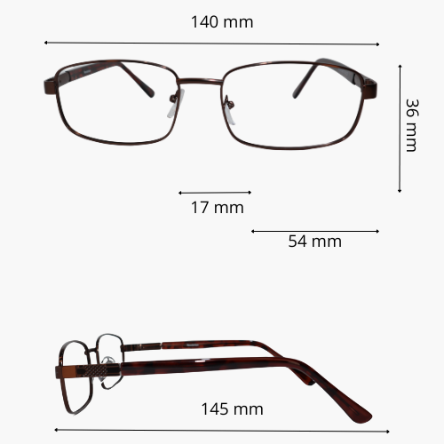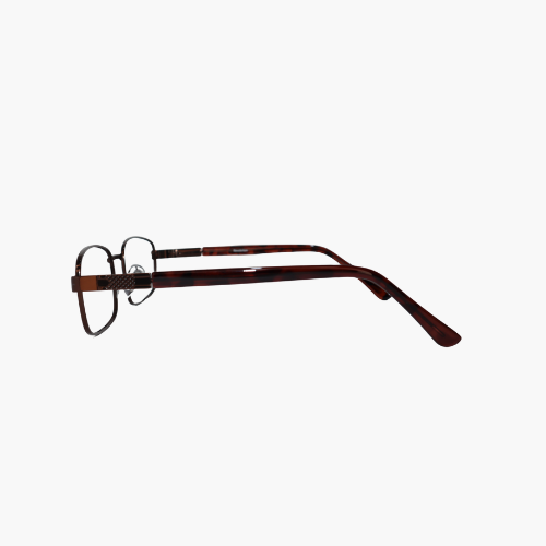 Diseño clásico y funcional, con estructura metálica en tono café oscuro satinado y varillas en acetato tipo carey, que combinan firmeza y elegancia atemporal. Su forma rectangular amplia ofrece un campo visual cómodo y favorece rostros medianos y anchos. Fabricado con materiales ligeros y resistentes, ideal para uso diario o profesional.